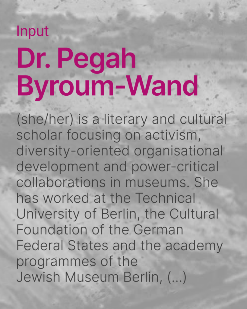 Pegah is a literary and cultural scholar focusing on activism, diversity-oriented organisational development and power-critical collaborations in museums. She has worked at the Technical University of Berlin, the Cultural Foundation of the German Federal States and the academy programmes of the Jewish Museum Berlin, among others. She is currently conducting a comprehensive study on post-migrant and postcolonial remembrance initiatives in Germany for the Ruhr University Bochum, and is the editor of the anthology ‘PowerCriticismCollaboration: Practical Reflections between Activism, Museum and University’ (2025).