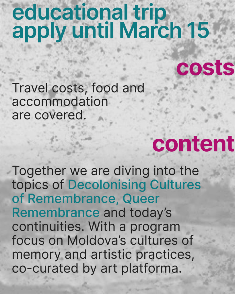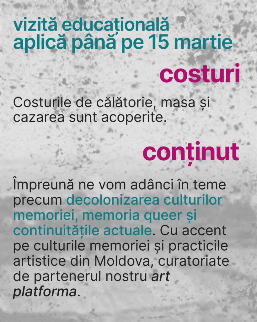 The project has been carried and inspired by a huge network of comrades, activists, artists and educators. For the recent episode of “Cultures of Remembrance” together with Educat Collective, there is Art Platforma, Moldox, Queer Voices, Coopera, Human Constanta, Prismatica and Solidarity Collectives involved as main partners.