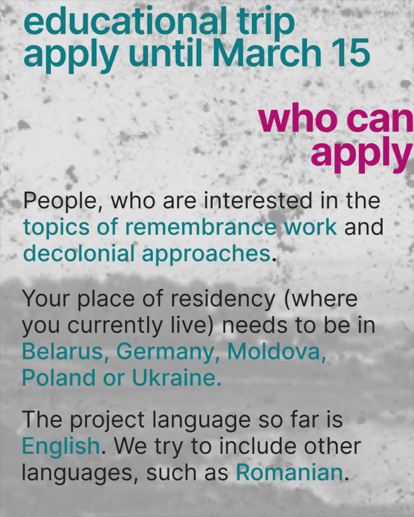 We are looking for participants who are interested in the topics of remembrance work and decolonial approaches. Your place of residency (where you currently live) needs to be in the funded partner locations Belarus, Germany, Moldova, Poland or Ukraine. It is important to note that this project stands firmly against nationalism and promotes dialogue. Please keep this in mind when applying.