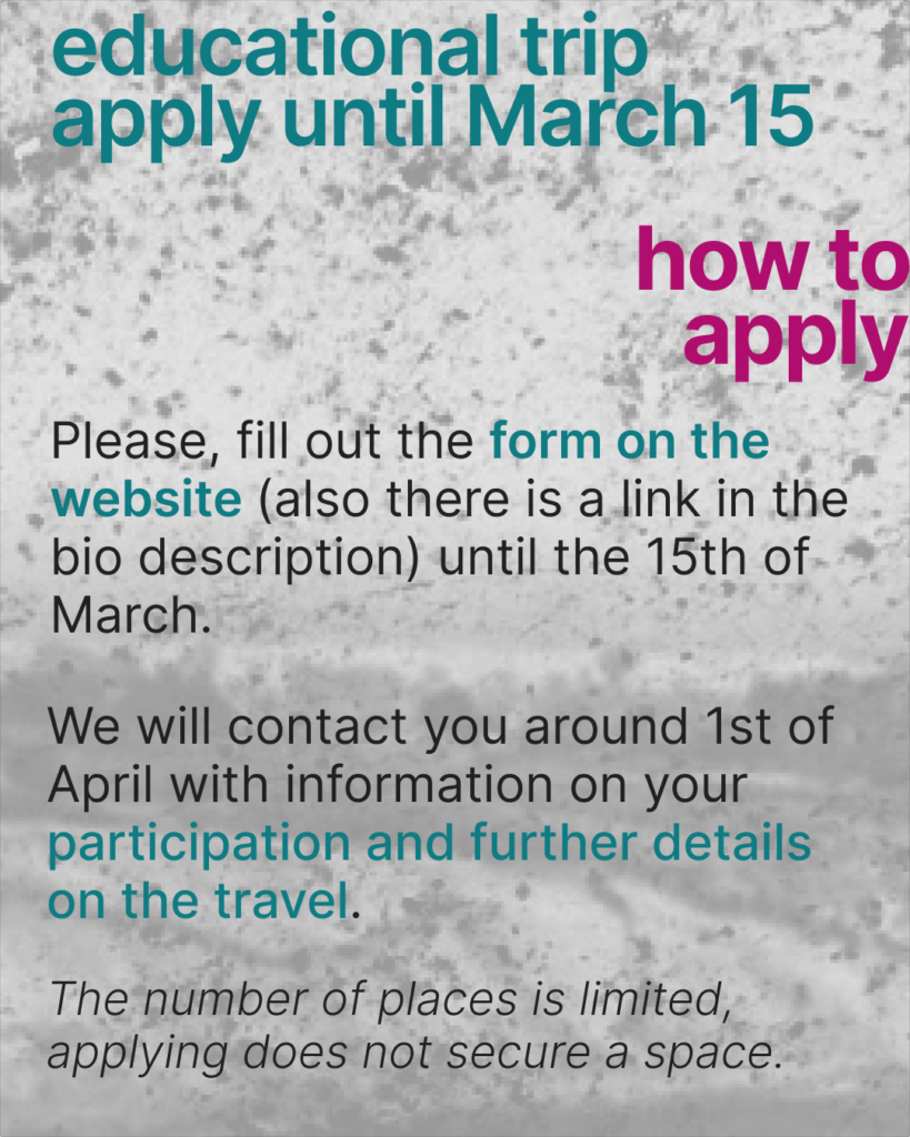 registration: Application process is open until 15th of March. The number of participants is limited, in order to to take part, please, fill out the form: https://cloud.educat-kollektiv.org/apps/forms/s/zkRZ9k7pxiyRSGRd7tbeqNEm