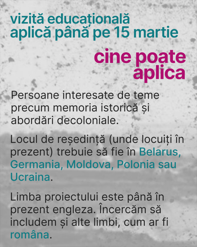Căutăm participanți interesați de temele legate de memoria colectivă și abordările decoloniale. Locul de reședință (unde locuiți în prezent) trebuie să fie în una dintre țările partenere finanțate: Belarus, Germania, Moldova, Polonia sau Ucraina. Este important de menționat că acest proiect se opune ferm naționalismului și promovează dialogul. Vă rugăm să țineți cont de acest lucru atunci când aplicați.