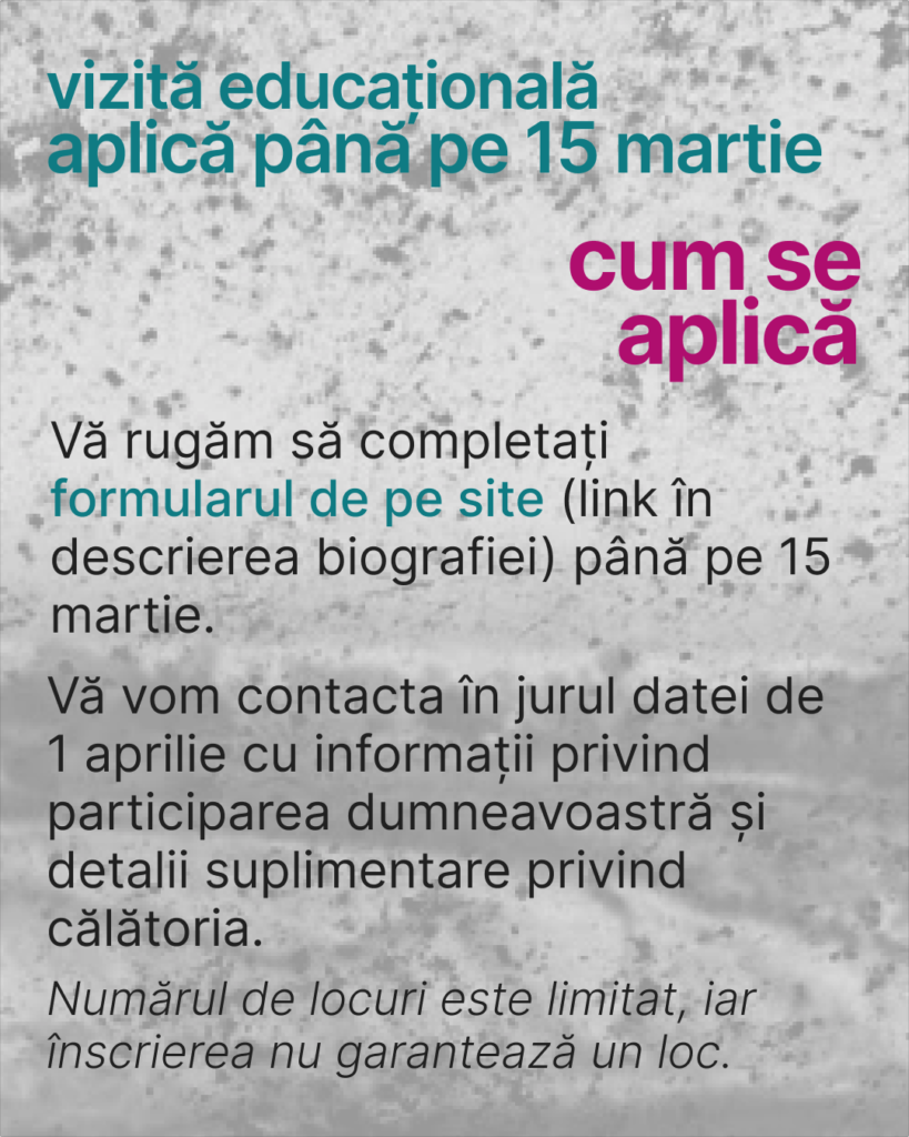 Vă rugăm să completați formularul https://cloud.educat-kollektiv.org/apps/forms/s/zkRZ9k7pxiyRSGRd7tbeqNEm până la data de 15 martie. Vă vom contacta înainte de 1 aprilie cu informații despre participarea dumneavoastră, deoarece numărul de locuri este limitat. Mai multe informații despre program și călătorie vor fi furnizate după confirmare. Pentru mai multe informații și dacă aveți întrebări, puteți contacta: remembrance@educat-kollektiv.org